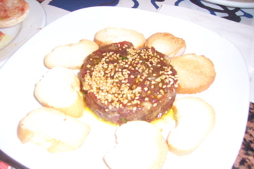 The first course was a tuna tartare, which was impossibly tender and flavorful while still modest in its own right. It was served simply with sesame seeds which added a nice crunch, but the attraction in this course was the sheer flavor and melt-in-your mouth texture of the jello-esque tuna. (below)