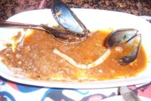 Finally, the monkfish course arrived. Ah, monkfish. Is there a better combination of steakiness and mildness out there in that giant ocean than these specimen? Cal Pep knew how to take advantage of the possibilities, and after deboning a generous portion of monkfish (below), we dug into a perfect example of this fantastic fish. It was steaky without being fishy or overly rich, and was prepared simply with olive oil and garlic, which were perfect complements. Anything more would have been overdoing it. Probably the best piece of monkfish that I’ve ever had.