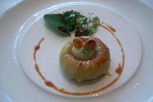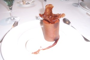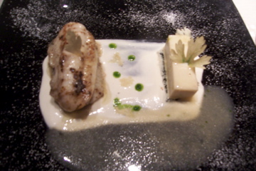 A few amuse bouche arrived, including a very salty cod-chip creation and a delicious chocolate bon bon. We of course decided to go with the four-course tasting menu which seemed reasonable enough for lunch. The first course was duck liver covered in a carmelized vanilla, and it was absolutely mind-blowing. The sweetness and crunchiness of the carmelized top layer blended amazingly with the rich, delicate nature of the liver. Lisa couldn’t finish it all because it was so rich, so I gladly helped her out against my better judgment simply because I couldn’t stop eating it. The richness of this dish was beyond measure! The consistency and intensity of flavors reminded me of creme brulee. (below)