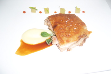 Having consumed two incredibly impressive courses, we readied ourselves for the meat course of roasted suckling pig. We’d enjoyed this Spanish specialty earlier in the week at the world famous Sobrino de Botin in Madrid, and it was great, but something told me this baby pig had potential to be spectacular, and I wasn’t incorrect. The pig was incredibly tender and had a perfectly roasted layer of pig skin that added a delicious crunch to the tender, flavorful meat. (below)