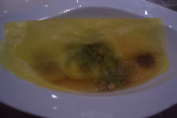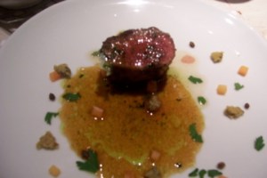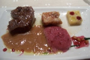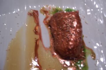 I was nearly full by this point, but the fish and meat courses were still to come, and since we had split our orders, that meant that I had four courses yet to sample. We absolutely loved the sole dish, which came in a sweet, creamy sauce and was perfectly tender. The balance of flavors was perhaps displayed best in this course, which was far from “fishy” and tasted more like dessert! (below, top) The monkfish came wrapped in a crust of bronze! (below, bottom) It was also very tasty, although we both enjoyed the sole the most of the two, which says a lot more for the sole than it takes away from the monkfish.