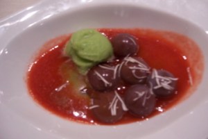 I was beyond stuffed by this point, but that didn’t stop what seemed like a never-ending string of dessert courses from finding their way to our table. First there were chocolates, including jelly-like chocolate balls (below, top) and another course of creamier mint balls filled with dark chocolate. Wow did these go well with the subtle chocolate undertones of our delicious Rioja! The next set of desserts included an amazing “champagne ravioli” as well as dry ice of pineapple along with a steaming hot creme de cocoa that oozed onto the dish (below, bottom), all again with careful design and presentation.