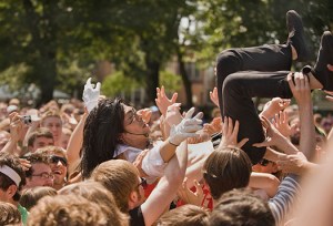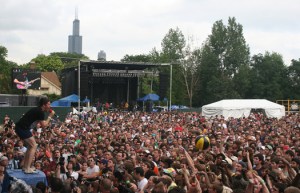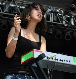 Other notable moments: On paper, I was a bit concerned about what I would do on Sunday before the Dodo’s came on, as I wasn’t too familiar with any of the early acts. However, Times New Viking kicked the day off with some highly energetic and original song structures, and I thought the chick on keyboards and sharing vocals (Beth Murphy, below) was amazing. After that, Dirty Projectors sounded really solid on “Rise Above” to calm the crowd before the metal onslaught of Boris ensued. I’m not a heavy metal fan at all, but these guys put on a great show and really rocked on “Pink”, complete with a gong, a female lead guitar player and stage diving (below), only to be cut short by more sound problems. And what else can be said about Les Savy Fav? The music is catchy but not spectacular, and I think the band knows this, as they once again made for it with some of the craziest, borderline abhorrent stage antics you’ll see anywhere. I even thought Apples In Stereo played a decent set of sweet, almost cheesy pop through the day’s hottest hour. I felt like I was in that movie “That Thing You Do” there for a minute.