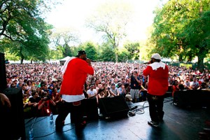#4: Ghostface Killah and Raekwon- This might have been the #1 set of the day if they didn’t chop the songs up so much. Last year, Clipse gave one of the most astonishing live rap performances I’ve ever seen, and these Wu-Alums had the same energy from the mostly white crowd on songs like “C.R.E.A.M.” and “4th Chamber”, but sang only one verse of each. I suppose that’s the problem with being part of an eight-piece rap albatross. They pretty much ran the whole docket, starting with a full version of “Criminology” and touching on most of the Only Built for Cuban Linx tracks, other highlights of which were portions of “Glaciers of Ice”, “Ice Cream”, “Rainy Dayz” and “Incarcerated Scarfaces.” Ghostface even cracked humorously when the crowd requested “Kilo” and his DJ informed him that he didn’t have the sample–somewhat shocking given that one’s popularity. But Ghost and Rae carried the set along without a hitch, substituting “Apollo Kids” and “Hit Me With A Strap” instead. This was as crowded and lively as the Balance Stage got all weekend.