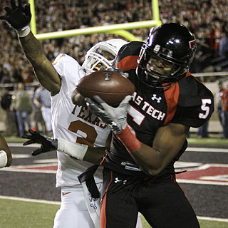 I’m sure there were lots of great games earlier in the day Saturday, and I watched them all, but somehow I forgot about all of them after seeing that amazing showdown in Lubbock. In what was easily the best game of the year up to this point, Texas Tech kept its amazing run alive as they battled back to beat Texas 39-33 in a game that they really controlled from start to finish. When Texas drove down the field and took the lead 33-32 late in the fourth quarter, it was hard to figure out how the Horns were in position to steal this one away after being outplayed from the onset. Texas Tech suffered late in the game from its lack of a strong field goal kicker, which forced them to play for touchdowns rather than field goals when the latter would have been more than enough to seal the victory. But, this time, Texas scored too fast, and gave the Red Raiders another chance with about a minute and a half to play, more than enough time for such a deadly offense. QB Graham Harrell nearly threw an interception that would have ended the game, but was fortunate to have Longhorn Blake Gideon drop the pass. Harrell made the best of his second chance, and connected with Crabtree on a risky timing pattern with 8 seconds left for the TD that was again a function of the uncertainty in the kicking game. Crabtree pounded this reality home as instead of diving out of bounds and setting up a chipshot field goal, he pivoted into the endzone for the game winner. Had he been tackled, the game would have been over. True drama.