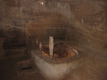 After lunch, we ventured down the stairs to the Cave des Papes, an ancient wine cave used thousands of years ago to make wine that fermented naturally in deep, carved-out vats (below). In addition to being a pretty amazing and historical discovery, the Cave is set up as a wine shop and tasting room. A very pleasant gentlemen poured us four tastes of wine here for no fee, my favorite of which was the Clos des Brusquieries Chateauneuf-du-Pape 2005 (90 Points). The wine shows perfumey wild berry fruit aromas above red fruit, licorice and minty mineral flavors, with black tea, wet limestone and a spicy cigar box note lingering.