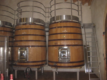 The highlight of the tour overall was our walk through the barrel-room, where we learned about French winemaking technique. Vieux Telegraphe ages their red wines for a year in steel barrels before putting them into incredibly large oak barrels (7,000 gallons compared to the 60 gallons typical of an American barrel) until they become ready for bottling. The use of steel early in the fermentation process combined with using much larger oak barrels than we see in America accounts for the lessened influence of the oak upon the character of the wine itself.