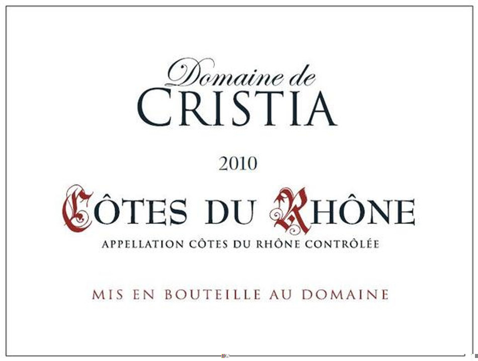 DOMAINE CRISTIA COTES DU RHONE 2010, 90 Points, $20, 1250 Cases Produced- Ripe and appealing on the nose, with fragrant crushed berry fruit and floral notes. This shows polished cherry, raspberry, boysenberry and red licorice flavors above layers of wet slate and spice. Long, gripping finish.