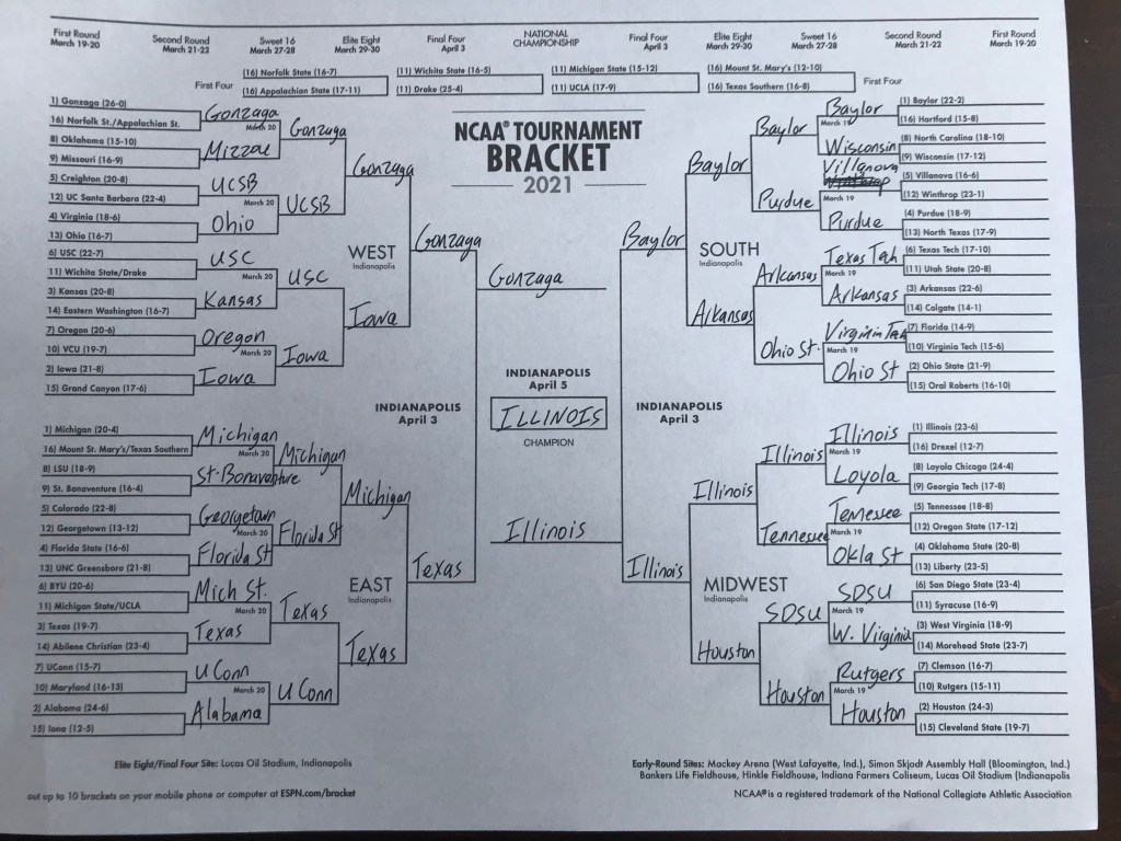 #1 Illinois over #1 Gonzaga: This is the title game everyone should be hoping for, and by the looks of it, will be a pretty popular pick, as well as a logical one. Both teams rank in the Top 10 in both offensive and defensive efficiency per KenPom; the only other team that can boast such a claim is Michigan, but they may not be able to duplicate those numbers without Livers. We will reverse the presumed outcome we see most experts leaning towards, however, in a game that could admittedly go either way. Gonzaga has two likely lottery picks in Jalen Suggs and first team All-American Corey Kispert, but can’t match the depth of the Illini, who can legitimately go eight deep and not lose a step, and has a matchup advantage down low with Cockburn (The third player off the Illini bench is Da’Monte Williams, who leads the nation in three point shooting percentage). Pedigree could make the difference here, as Illinois has played a top three schedule nationally, while Gonzaga’s ranks just 95th despite a respectable preseason slate. Look for the Illini to capture their first ever National Championship and the first for the Big Ten since 2000, while preserving a historic record for a certain fellow conference rival.