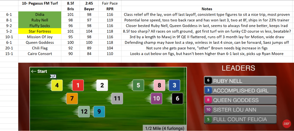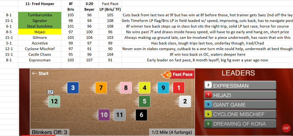 These picks list only the horses we would consider playing underneath in the deepest of exotic wagers, and runners not listed can be considered a tosses from all wagers in our view. They are presented in order of preference, with green cells indicating top selections and potential win contenders, and yellow cells representing potential backups and defensive uses of favorites in multis. Again, a sound strategy for the card appears to be trying to hit exactas that exclude the favorites that we want to stand against.