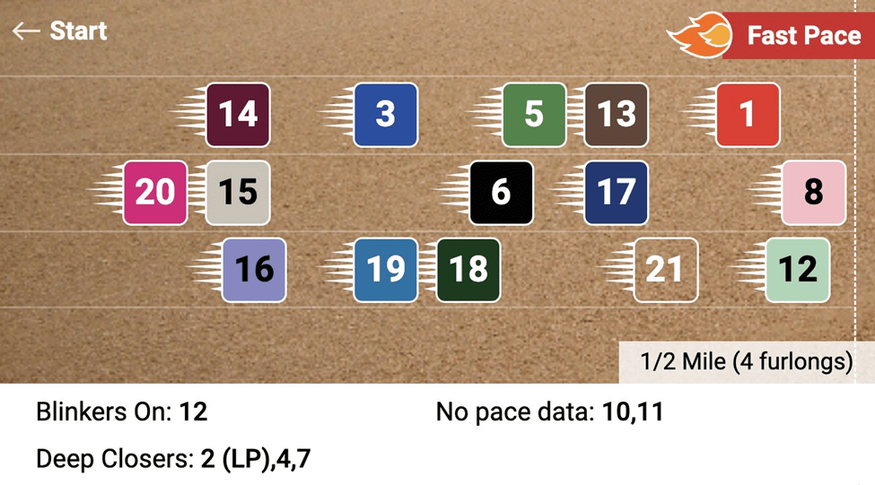 Cons: While brilliant on his best day, this colt’s performances have been highly inconsistent to date, even alternating dazzling efforts with completely puzzling ones; this spot would be due for a dud again if that pattern continues. The Todd Pletcher trainee has run best when allowed to get near the front of the pack and has struggled when caught behind the first flight of runners, so could be in for a tricky trip here drawn a bit wide and outside of the main speed competition. To this point, the Timeform Pace Projector (below) sees him vying for 4th early boxed in between horses. While his closing fractions have looked good both visually and on paper, the specific breeding here does not exactly scream 10 furlongs. We don’t view post position as a statistically significant red flag, but it bears mention that no colt has ever won this race out of #17 (although he will techincally break from #16 now after the Encino scratch).